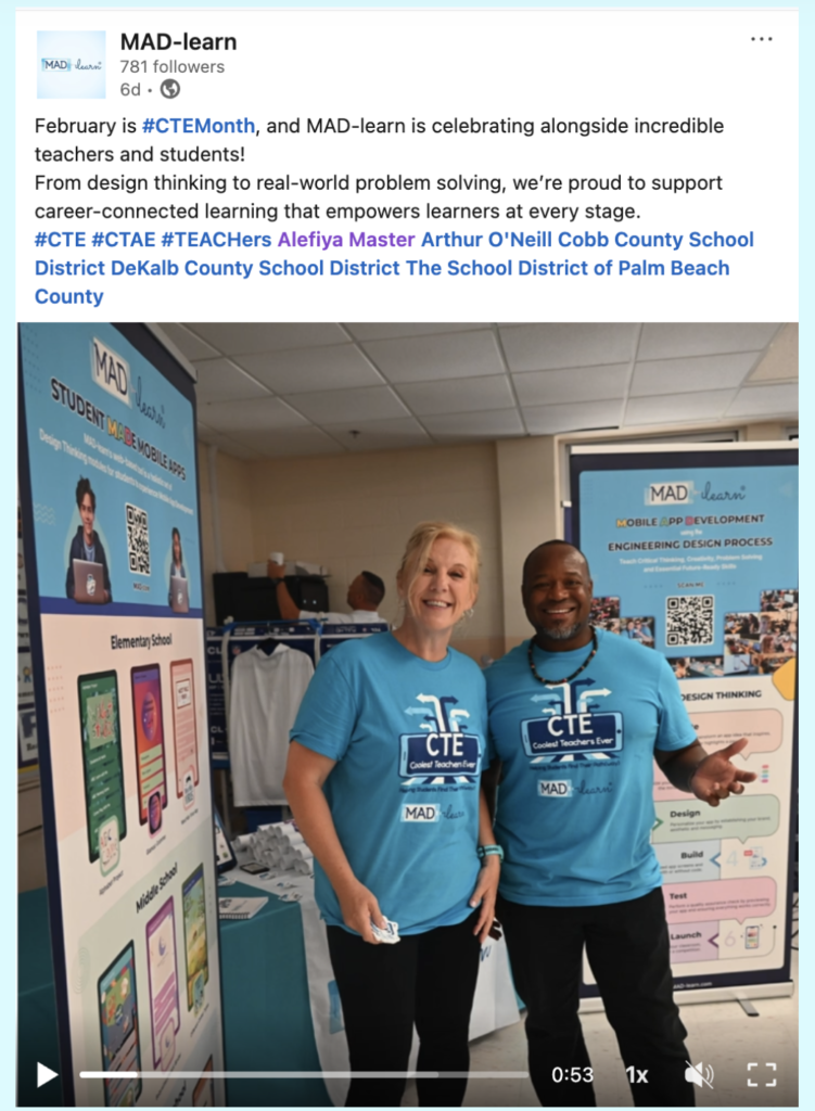 This month we are featuring Anne Benton, a Computer Science teacher at Creekland Middle School, in Cherokee County School District who brought MAD-learn into a powerful cross-curricular collaboration. Partnering with Social Studies teachers, her students created apps focused on water scarcity, directly connecting to a 7th grade Georgia Social Studies standard. As a first-time MAD-learn user, she shared that the project went really well and that she loved how app creation gives students a real-world reason to care about what they are learning.