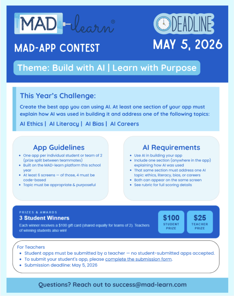 ..entering our annual MAD-app Contest! You and your students have a chance to win great prizes and get recognized on a national stage.